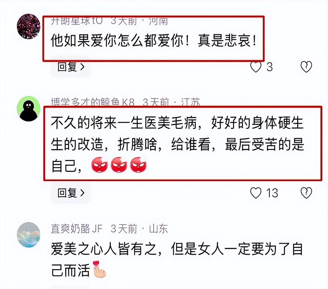 评论区里,有人一针见血地指出:“如果一个男人真的爱你,是不会让你去受这种罪的。”也有人感叹:“身体健康比什么都好,与其花这些钱整容,不如投资自己,提升内在。”这些评论,或许才是真正值得我们思考的问题。
