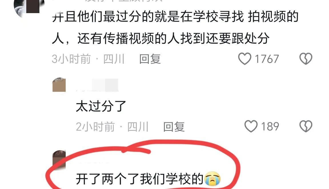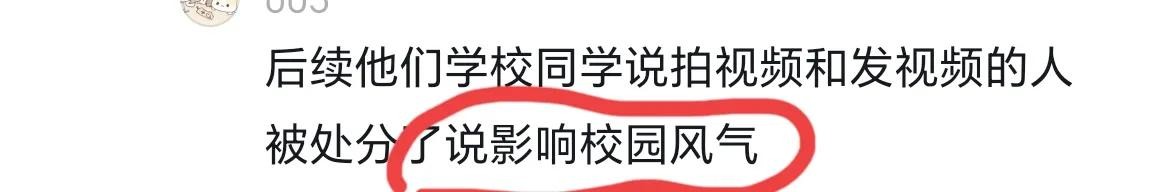 随后有疑似该校学生透露,学校在找拍视频的人,拍摄视频和传播视频的学生,都受到了处分,疑似被开除了。