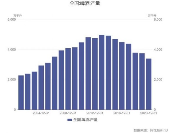 自2013年至今,则进入了发展的第四个阶段。一个值得关注的现象是,2013年是我国啤酒产量一个分水岭,在2013年以前,我国啤酒产量逐年增加。到2013年达到4982.79万千升的产量见顶之后,啤酒产量逐年开始减少,行业增速也开始放缓。