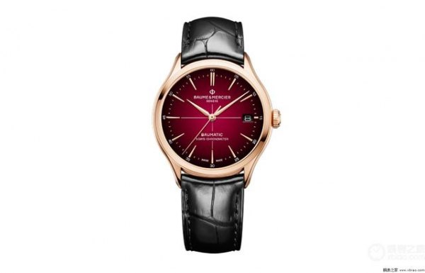腕表点评:这款名士克里顿系列腕表是三款腕表中唯一一款采用贵金属打造腕表表壳的腕表,40毫米的18K玫瑰金表壳,经过缎面打磨后,将渐变勃艮第红色盘面的映衬的更加明艳夺目。腕表盘面上设有十字坐标,是象征机芯精准走时的标志。盘面三点钟位置设有日期显示窗口,盘缘梯形铆钉式镀铑刻度搭配Alpha形刻面指针指示时间。腕表内部搭载一枚Baumatic自动上链机芯,机芯经过瑞士官方天文台认证,走时精准,值得一提的是这枚机芯在上满链后可为腕表提供长达5天(120小时)的动力储存。