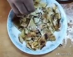 (4)将鸡蛋饼切成块,撒上干淀粉,