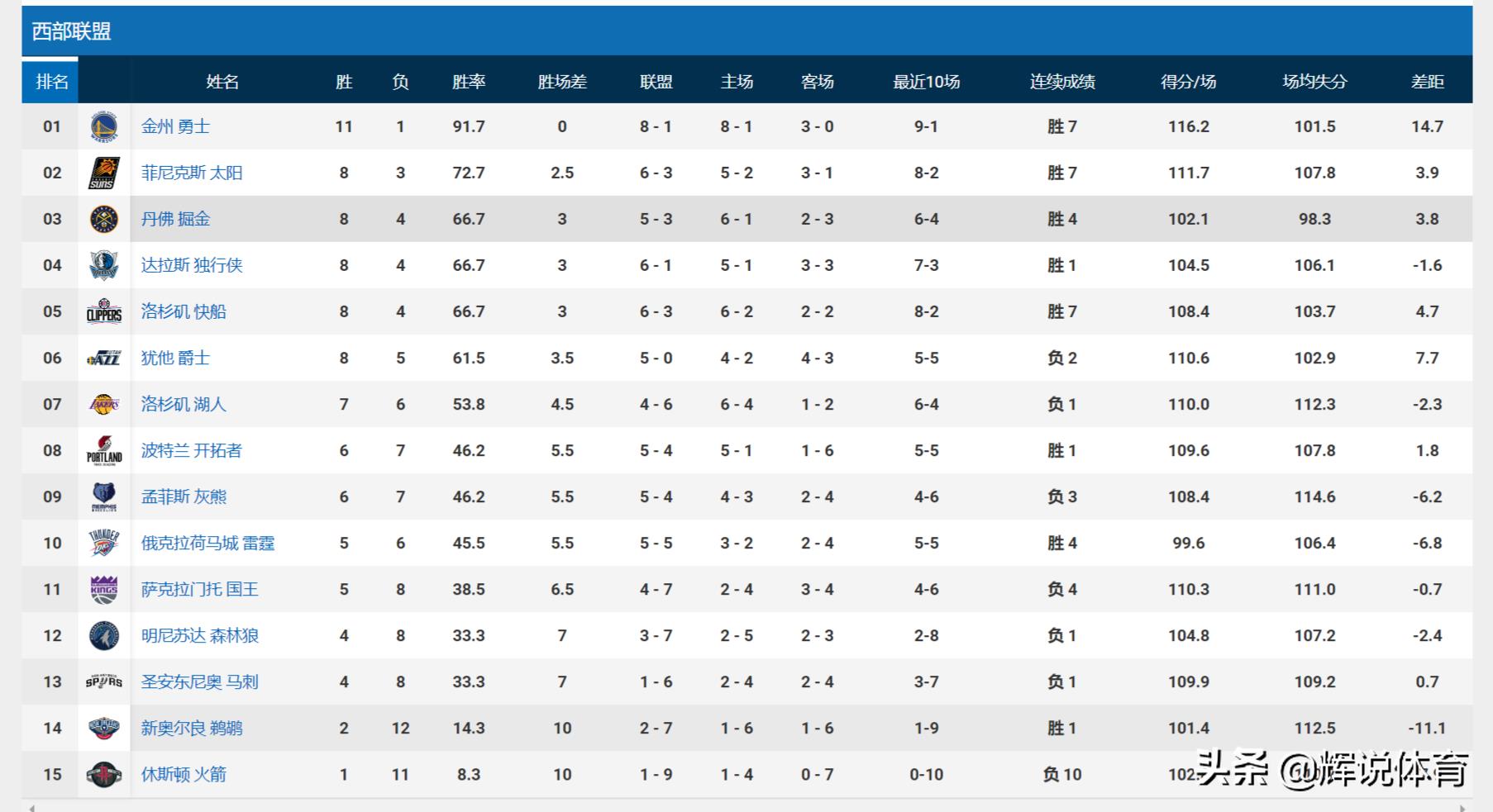 NBA西部最新排名,勇士榜首,快船第五,火箭垫底