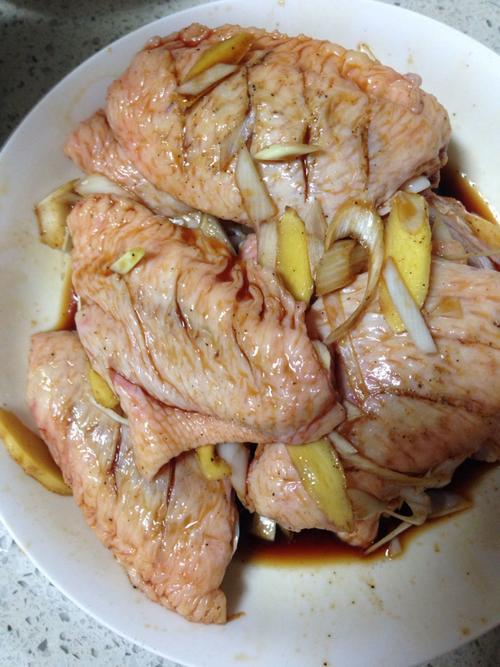 中鸡翅7个、锡纸7张、生姜少许、大蒜少许、老抽一小勺、生抽一小勺、黑胡椒粉少量、黄酒一小勺、醋几滴就可以了