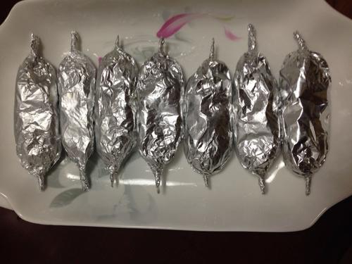 4、下面重点就是锡纸喽!剪成一个比鸡翅稍大一点就可以了,只要能包住鸡翅!像糖果一样拧紧!拧的时候不要太用力!防止脆弱的锡纸破损!