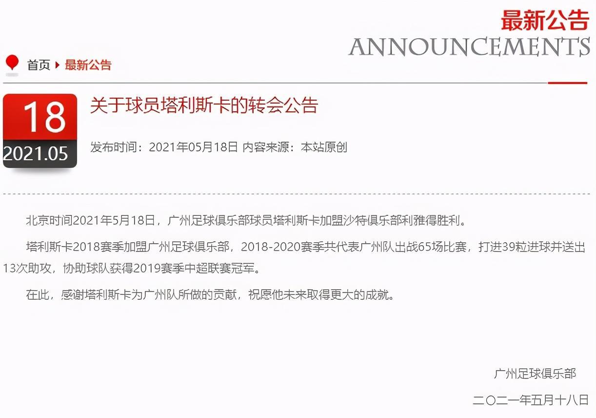 以上就是广州队俱乐部的官方公告内容!据之前多家媒体以及德国转会市场的资料显示,塔利斯卡从广州队加盟利雅得胜利的转会费高达800万欧元。