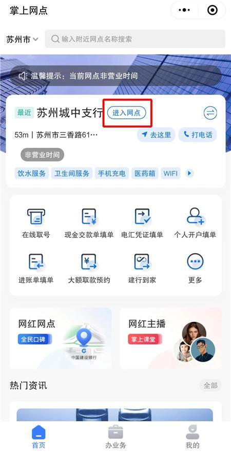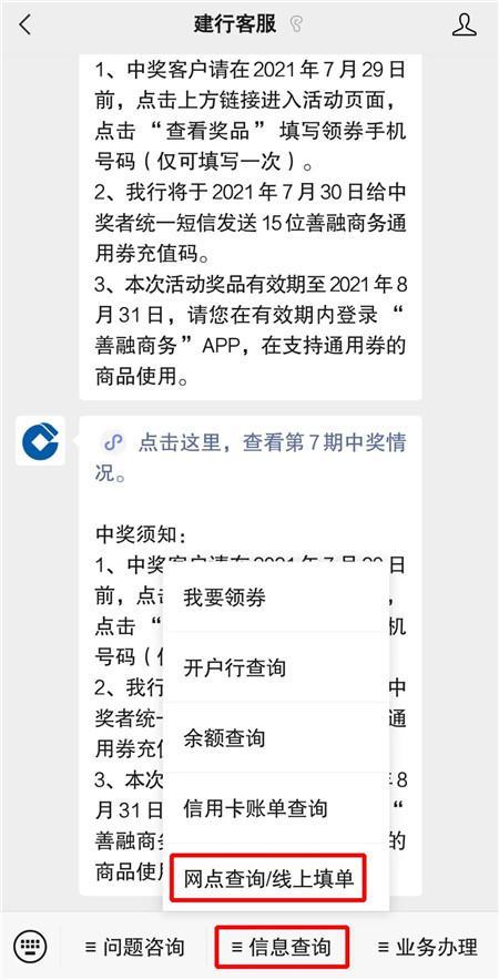 关注并进入建行客服微信公众号,点击信息查询-网点查询/线上填单,页面将自动显示最近网点,也可搜索网点名称获取网点信息。