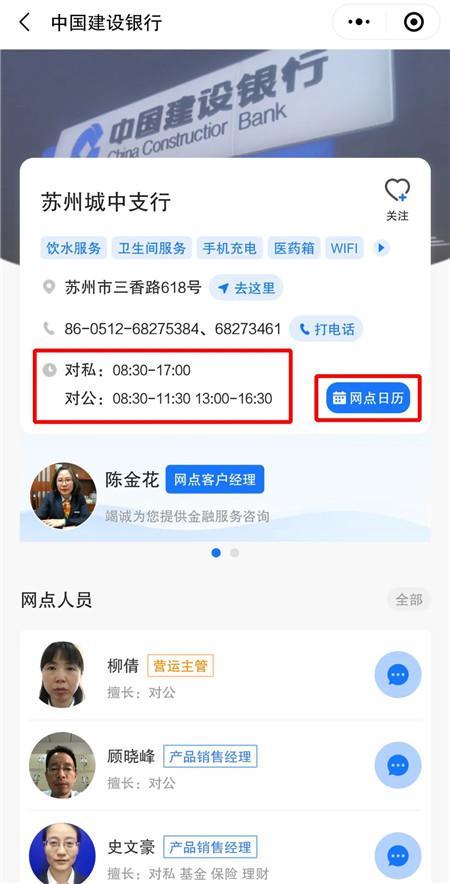 点击网点右侧进入网点,系统就会显示网点当日营业时间,进入网点日历,即可获取近期网点营业时间。