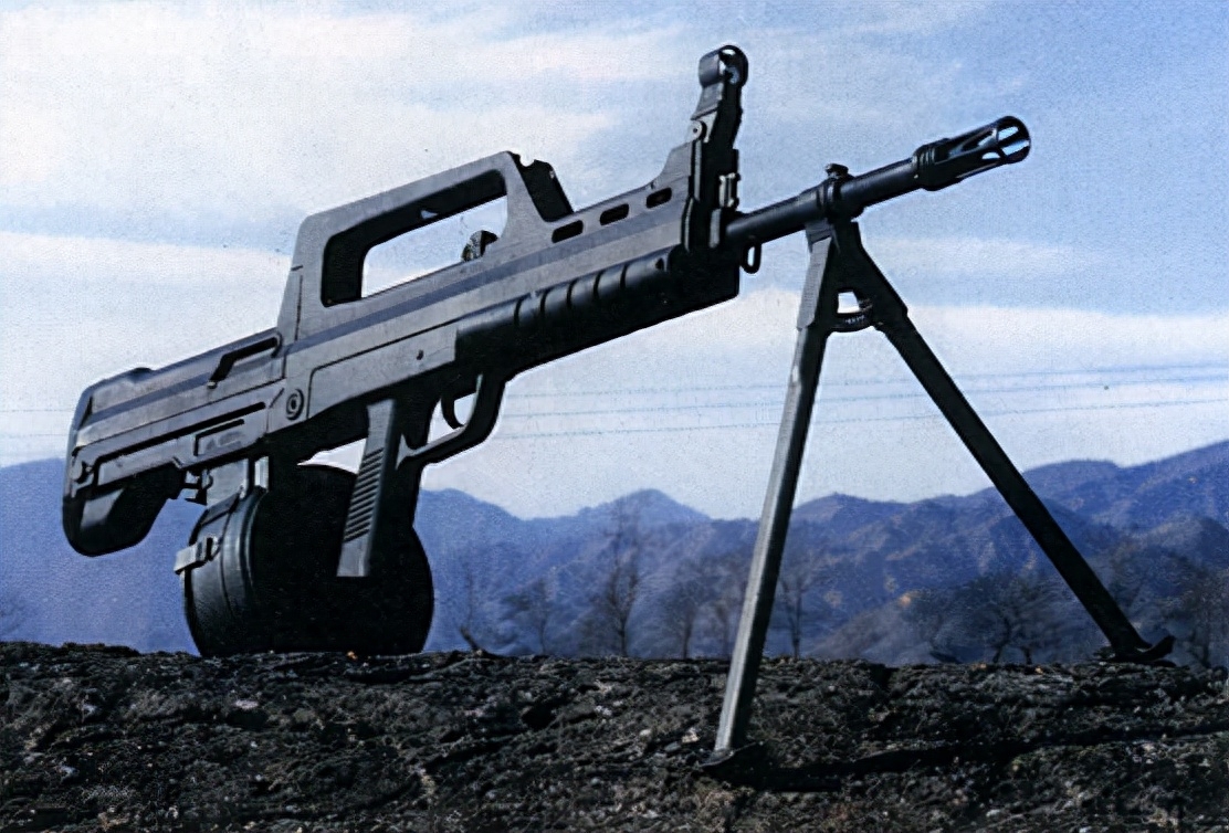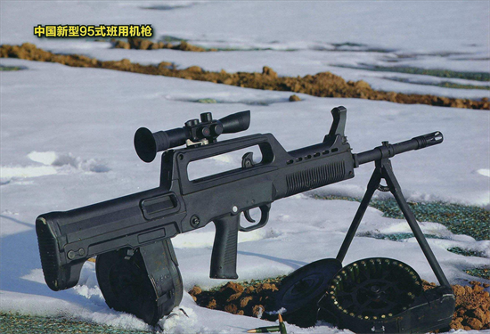 95式5.8毫米轻机枪是95枪族中的轻机枪,是中国陆军现役主力轻机枪。从外形上看和95突击区别不大,只是加装了两脚架和更长更厚重的枪管,主力供弹具也由弹匣变成了弹鼓。