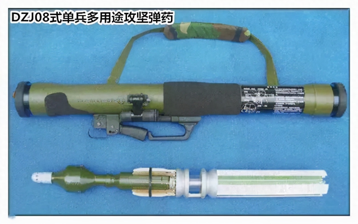 2000年左右,中国开始立项在89式62毫米火箭筒基础上研制新一代单兵火箭筒,2008年北方工业公司推出DZJ08式80毫米单兵火箭筒,量产服役。和89式一样,这是一款一次性用后即弃型火箭筒,套筒和火箭弹总重量7.5公斤,长度971毫米,发射火箭时会从发射筒后部抛出抵衡质量、以平衡火箭发射的后坐力,抛出的是2000多层的塑料片,光学瞄准,有效射程 300米,串联战斗部,一级战斗部为撞击引信, 二级战斗部为电子延时线路引信,破甲能力不行,只有60毫米,但串联战斗部的延时引爆特性,很适合在城市巷战中拆墙打洞破坏建筑物,可以击穿300毫米钢筋混凝土墙。