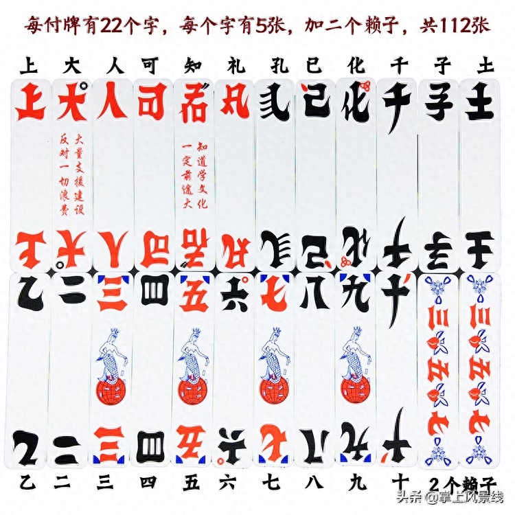 牌面的字:上、大、人、孔、乙、己、可、知、礼、化、三、千、七、十、士、八、九、子、二、四、五、六,共计22个字,每个字有5张,共110张牌;