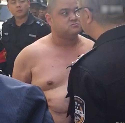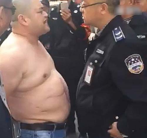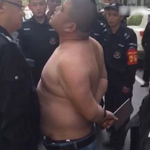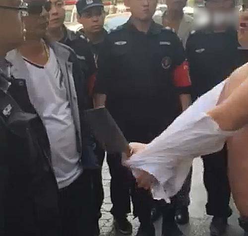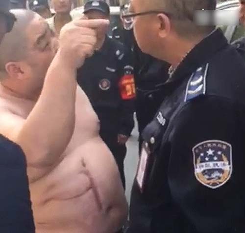 4月19日上午9时许,王国强的中队与淮河路办事处的工作人员一起,上街清理辖区内占道经营的摊贩。清理到河南郑州市汉江路与嵩山路交叉口东北角一家胡辣汤店时,发现该店在门前的人行道上,摆了一些桌凳和灯箱。执法人员上前清理占道物品时,一名光头、体型较胖的男子掂着一把菜刀,从店里冲了出来,对着执法人员大声叫骂。他上前制止,被对方指着鼻子辱骂和威胁。图为男子持刀脱衣。