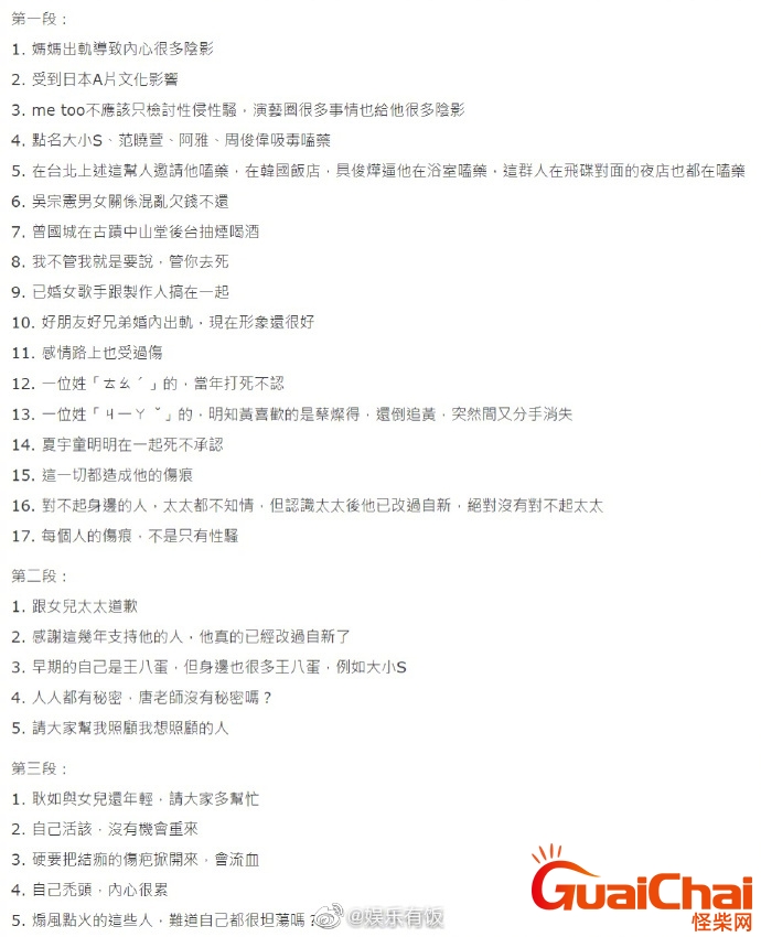 今日事件源于metoo事件一位女网友发文称17岁的时候被强吻、拍裸照,由于爆料文字中提到电台主持、音乐、有女儿等线索,许多人都猜测就是黄子佼。今天中午黄子佼发布了三段自拍影片回应了,承认了当时的所作所为,还爆料大小s范晓萱周峻纬光头吸毒(不过这个周俊伟不是内娱演员周峻纬),还爆料吴宗宪男女关系混乱欠钱不还,曾国城在中山堂后台抽烟喝酒,已婚女歌手和制作人在一起,好兄弟婚内出轨形象还很好……