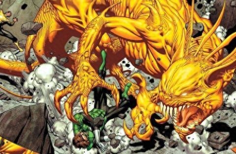 绿灯的灯兽叫离子鲨,长得像绿色的鲨鱼,它是最惨的,在跑路的时候被咬掉一半,逃进实体宇宙的时候已经是奄奄一息了,全靠意志坚强才活了下来,所以就是产生了意志和勇气的情绪。
