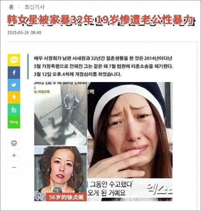 19岁的她正当红,嫁给了韩国搞笑艺人徐世源,接下来的生活并没有如童话般灿烂美好,带给她只有无尽的黑暗和痛苦。据徐贞姬本人透露,19岁和老公第一次相遇时就遭遇性侵,但因当时社会环境封闭,只好忍气吞声,选择结婚,但没想到这个噩梦持续了32年。徐世源不仅对她拳打脚踢,还偷吃出轨,被抓包还不知悔改,甚至威胁徐贞姬“不准和我离婚,否则杀了你”。
