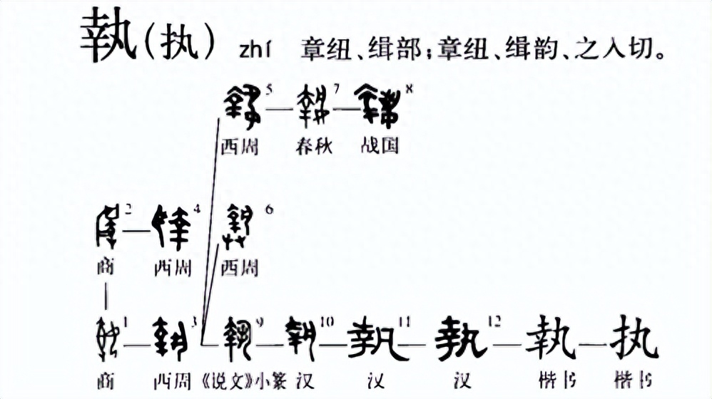 执字的本义为拘捕,由此引申为握着,拿着,如:执笔;又引申指掌管、从事、施行等。