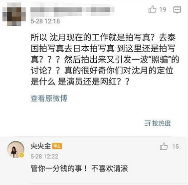 原本走黑红路线的沈月在经纪人央央金被关注后也收获了一定的关注度,但是因高颜值深受网友喜爱的央央金却因一次在微博怒怼沈月粉丝给自己和自家艺人都招黑了。事件的起因是一位沈月的粉丝在央央金微博下评论称沈月现在的工作就是去各个国家拍写真,并表示自己很好奇经纪人对沈月的定位到底是演员还是网红?