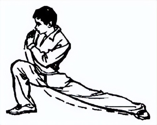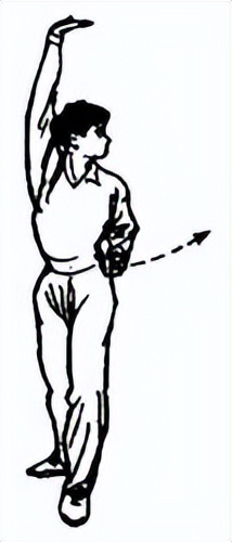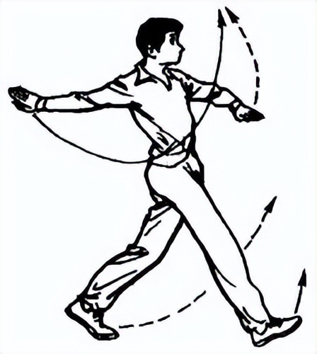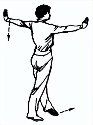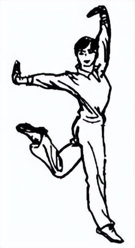 (3)右腿外摆成扇形,上体微前倾。两手依次击拍右脚面。