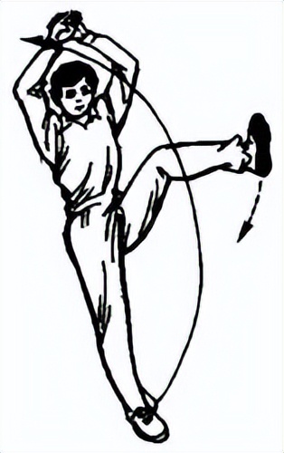 (2)上右腿起跳,摆扣左腿,从两手头上去响向右转180°,逐步做到360°的“转体跳”练习。