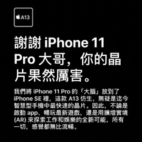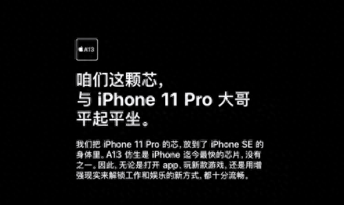 从苹果给出的介绍看,这款新iPhone SE最大的亮点便是升级到了与iPhone 11系列一样的A13仿生芯片,堪称是性能“小钢炮”,中国官网这么介绍: