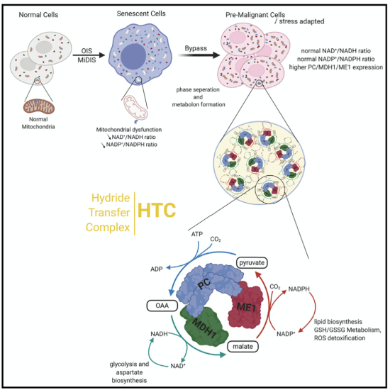 细胞衰老是一种广泛作用的肿瘤抑制机制,其中携带致癌突变的细胞由于线粒体功能障碍、氧化应激、DNA 损伤和肿瘤抑制因子激活的慢性状态而不能扩展。线粒体功能失调是新生细胞对短端粒或癌基因反应的一个标志。线粒体功能障碍相关衰老的特征是 NAD+(烟酰胺腺嘌呤二核苷酸,一种转递质子的辅酶,它出现在细胞很多代谢反应中,NAD 的氧化形式)/NADH(NAD 的还原形式)减少,活性氧(ROS)增加。因此,了解癌细胞如何克服衰老特征的细胞增殖障碍(包括线粒体功能障碍)很重要。