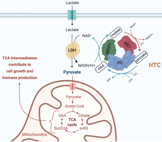 HTC 提供两种转化功能:依赖 NAD+ 再生的永生化和依赖 NADPH 生成的抗氧化活性。这些功能对于缺氧条件下的细胞存活或在乳酸中生长的不能利用 LDH(乳酸脱氢酶)反应再生 NAD+ 的细胞也很重要。HTC 酶在包括小鳞状肺癌和前列腺癌在内的几种癌症中的表达呈正相关,因此,靶向 HTC 可用于开发新型的抗癌治疗方案。