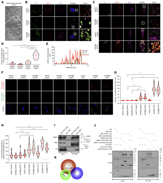 p53 和 RB 抑制一种酶复合物,该酶复合物催化代谢循环,将氢化物阴离子从 NADH 转移到 NADP+,从而再生 NAD+ 并供应 NADPH,经分析,这种氢化物转移复合物(HTC)由苹果酸酶1(ME1)、苹果酸脱氢酶1(MDH1)和丙酮酸羧化酶(PC)组成,可在体外与纯蛋白质组装。