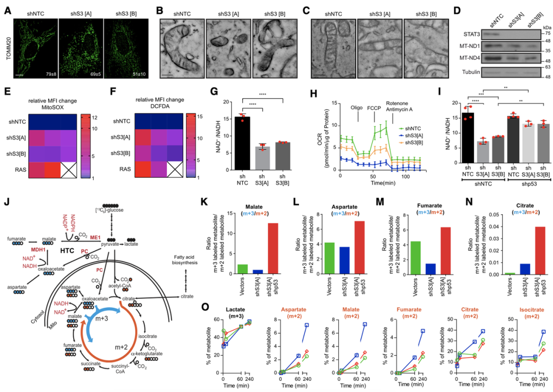 研究数据显示,HTC 酶导致 STAT3 缺失细胞的代谢重编程,以恢复 NAD+ 水平并增加 NADPH,这与抑制衰老表型平行。此外,HTC 过度表达细胞中的丙酮酸优先通过 PC 转化为 OAA,随后通过 MDH1 补充 TCA 循环(三羧酸循环,是需氧生物体内普遍存在的代谢途径)和 NAD+ 再生。总之,这些结果表明 HTC 过度表达细胞的代谢程序与在 p53 失能细胞中观察到的代谢程序相当,HTC 酶在催化 NAD+ 再生和 NADPH 生成的复合物中起重要作用,以减少氧化应激和绕过衰老。