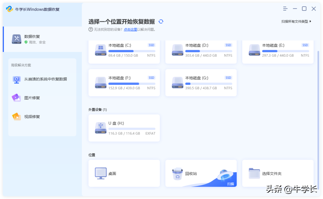 下载安装好牛学长Windows数据恢复工具,在主界面上,勾选丢失文件的位置。此处选择移动硬盘所在的盘。