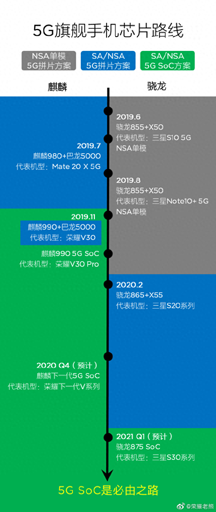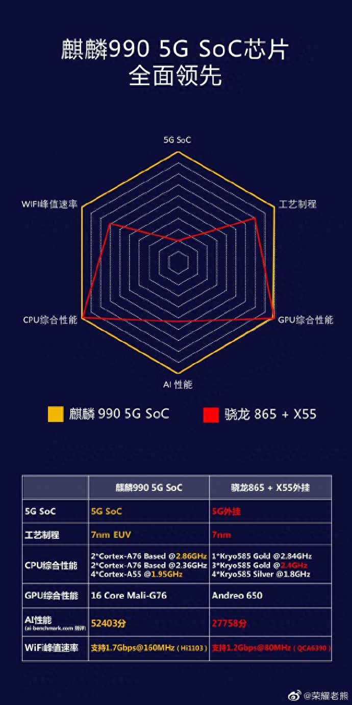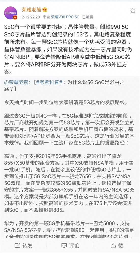 荣耀老熊微博科普:5G SoC是必然趋势,高通、苹果、三星也会选择