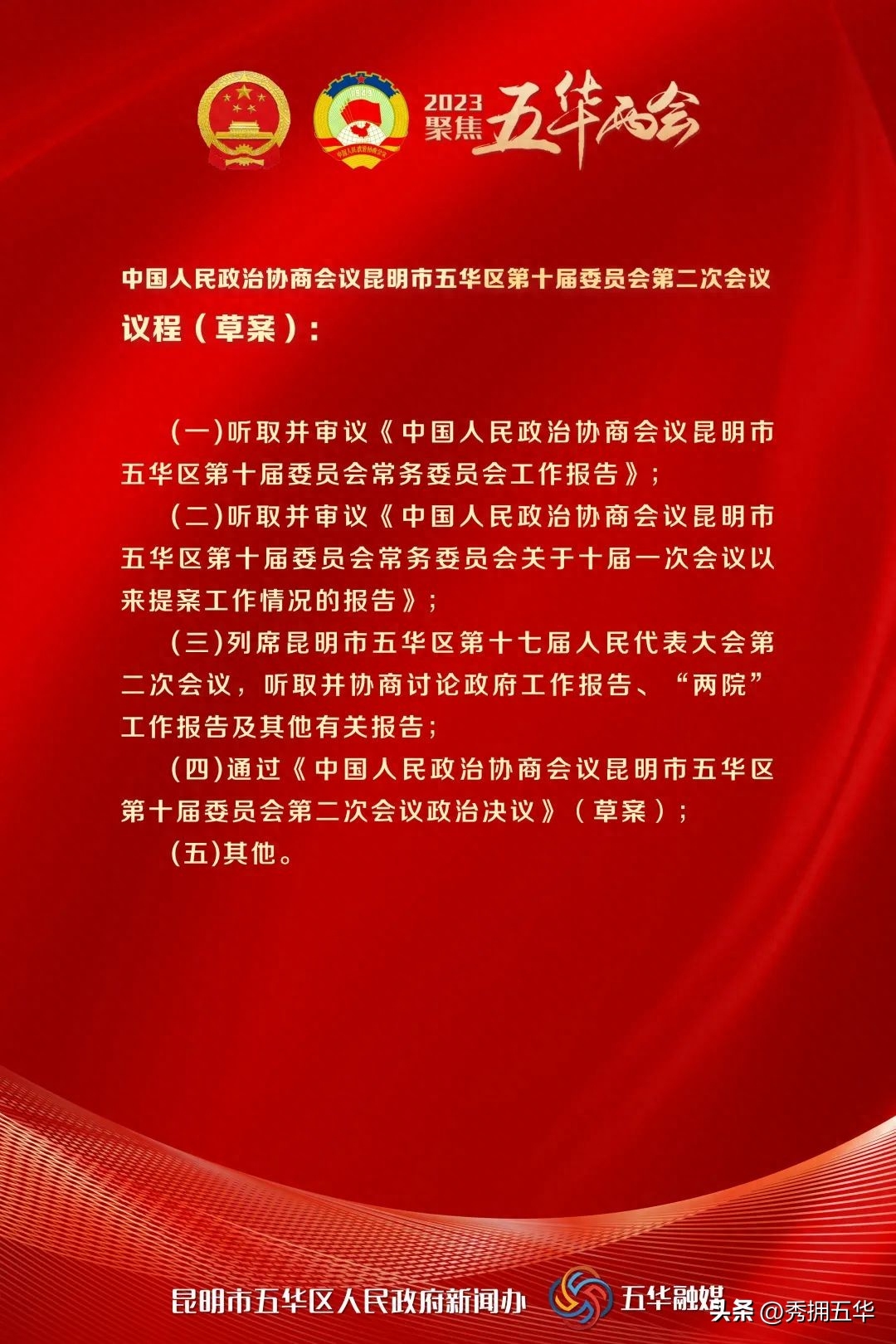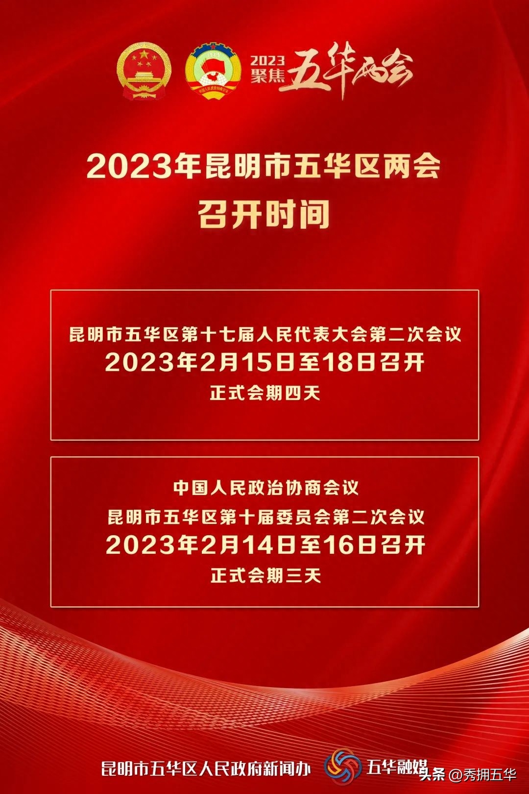昆明市五华区第十七届人民代表大会第二次会议将于2月15日至18日在五华区区级机关办公中心举行,会期4天。中国人民政治协商会议昆明市五华区第十届委员会第二次会议将于2月14日至16日召开,会期3天。