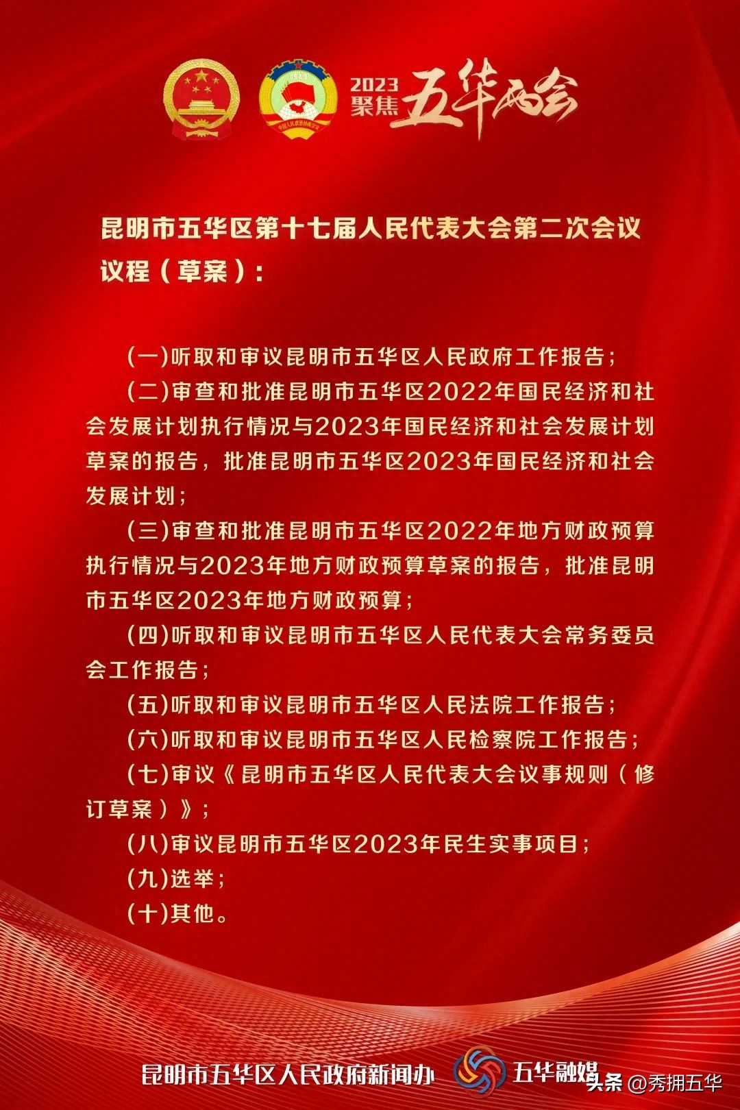 会议将听取和审议昆明市五华区人民政府工作报告;审查和批准昆明市五华区2022年国民经济和社会发展计划执行情况与2023年国民经济和社会发展计划草案的报告,批准昆明市五华区2023年国民经济和社会发展计划;审查和批准昆明市五华区2022年地方财政预算执行情况与2023年地方财政预算草案的报告,批准昆明市五华区2023年地方财政预算;听取和审议昆明市五华区人民代表大会常务委员会工作报告;听取和审议昆明市五华区人民法院工作报告;听取和审议昆明市五华区人民检察院工作报告;审议《昆明市五华区人民代表大会议事规则(修订草案)》;审议昆明市五华区2023年民生实事项目;进行选举及其他事项。