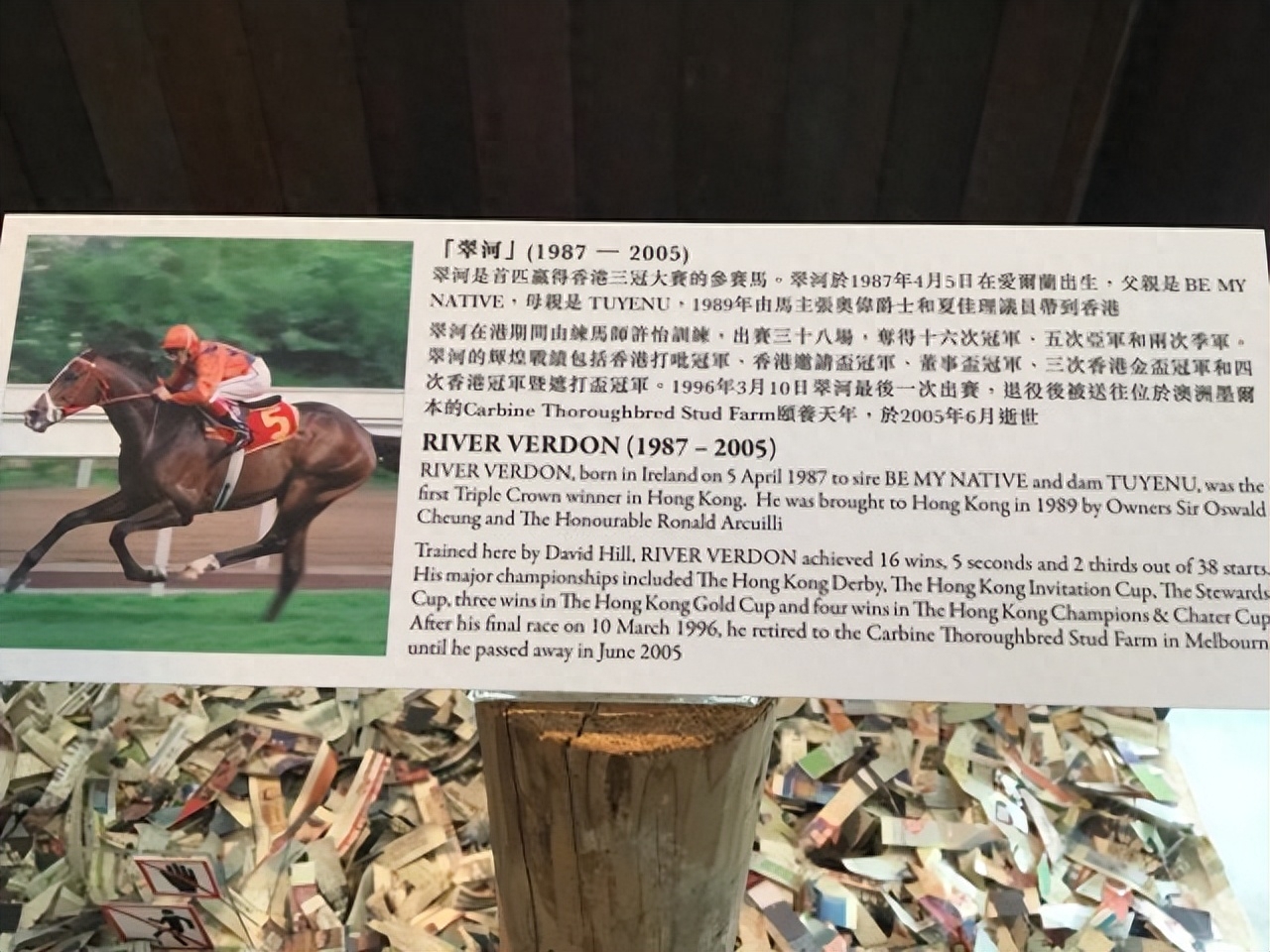 赛马博物馆里有大大的落地,玻璃窗在馆内就可以风雨无阻地看到外面马场上的赛马活动,博物馆里每一匹赛马都从它的身世开始介绍,父亲是谁,母亲是谁,最后在哪安享晚年。展品包括香港三届马王“禄怡”的骨架和“翠河”的标本。