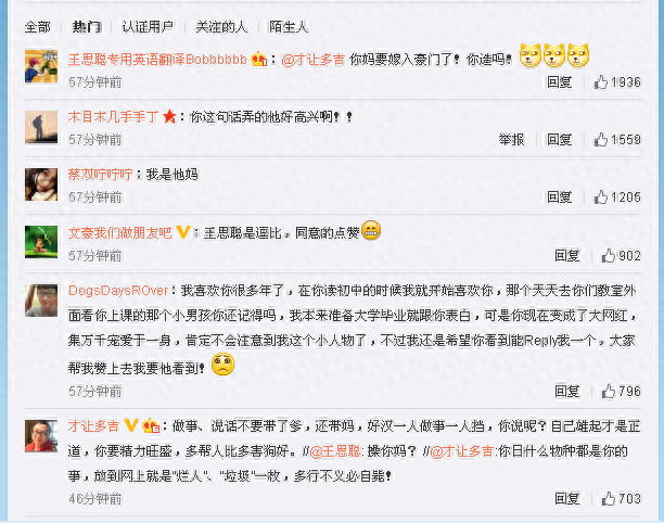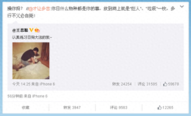 王思聪认真练习日狗大法微博公布后,有认证号自称“才让多吉”的网友对王思聪所发微博不满:“你日什么物种都是你的事,放到网上就是“烂人”、“垃圾”一枚,多行不义必自毙!”,王思聪也毫不示弱回到:“*你妈? //@才让多吉:你日什么物种都是你的事,放到网上就是“烂人”、“垃圾”一枚,多行不义必自毙!”