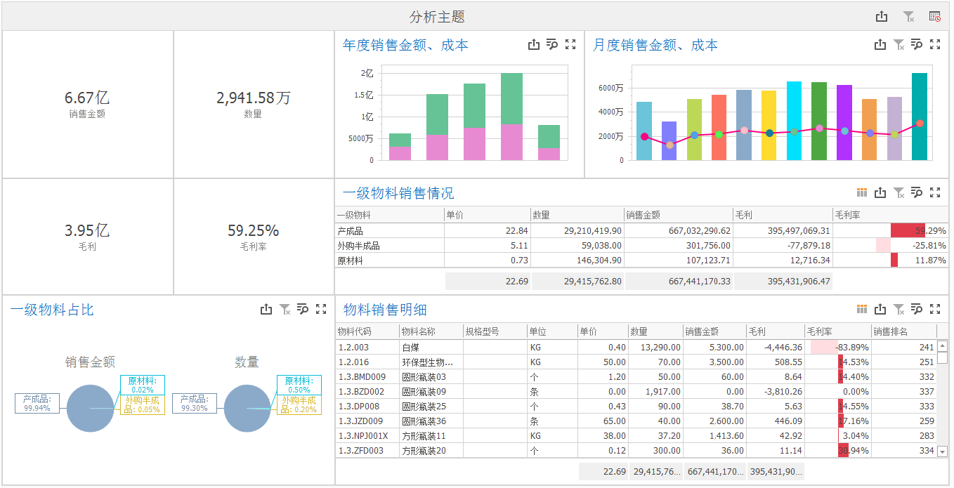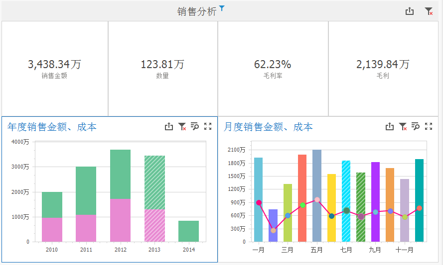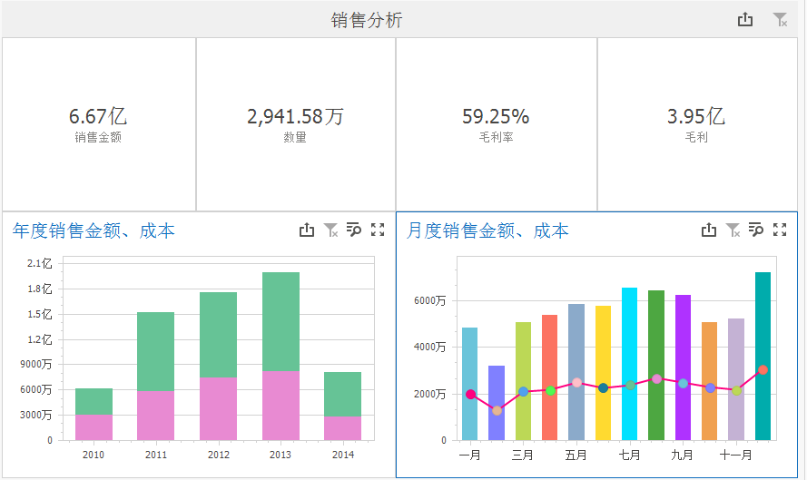 如上图所示,我们需将领导最关心的核心指标数据比如总的销售额、毛利、销售数量等情况清晰地展现出来。除此之外,领导可能还关心与前几年相比,今年的销售同比、环比的趋势增长情况,我们也可按需在图表上展现出来。