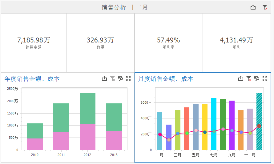 这时,若是领导想具体查看近几年某月的同比情况,比如我们选择“十二”月份,便能查看这几年十二月份的销售额、及成本的同比变化趋势: