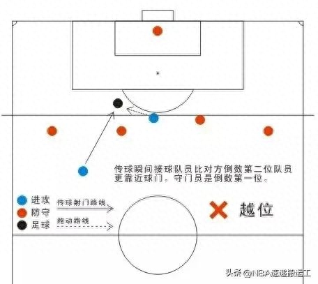 6.最为常见的,传球瞬间接球队员比对方倒数第二位球员更靠近球门(守门员为对方第一位球员)