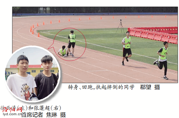 对此,张蓬超说:“当时心里没多想,看到同学摔倒了,我就想着得赶紧把他扶起来,毕竟中长跑只有一次测试机会,对我们谁都很重要。”