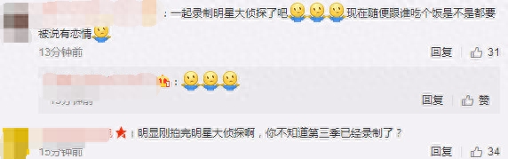 虽然二人在一起吃火锅,但是网友不认可就是在谈恋爱:他们俩只是朋友关系吧 ,出去吃个饭就是谈恋爱啦?更有网友摆出事实真相:明显刚拍完明星大侦探啊,你不知道第三季已经录制了?