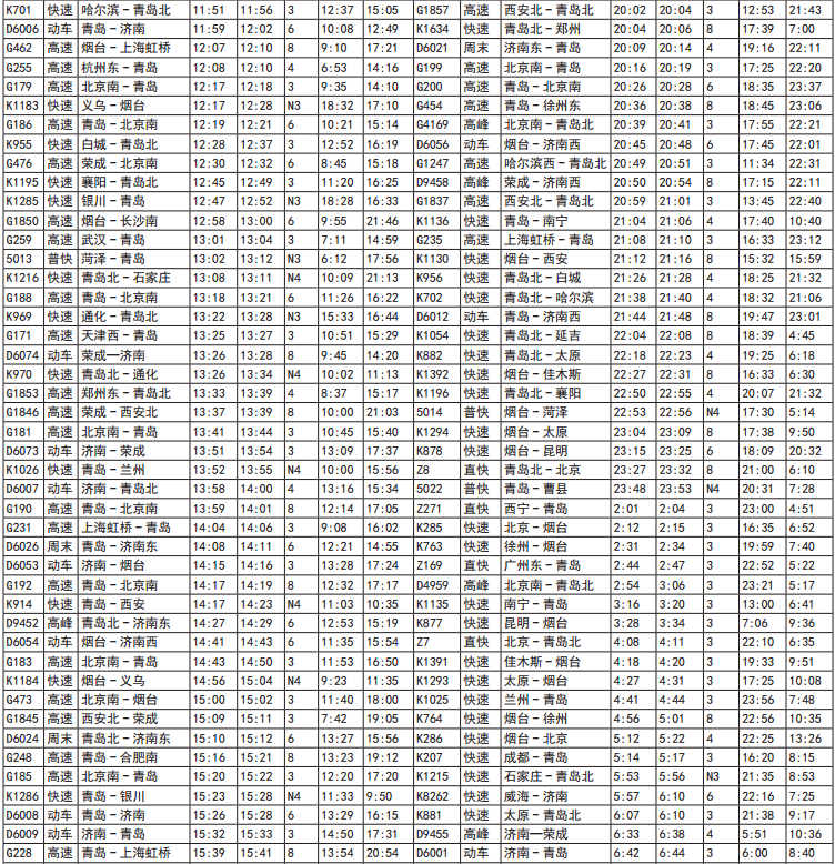 根据淄博火车站最新制定出的列车时刻表来看,深圳至青岛T395次列车,到发淄博的时刻有变,8:05到,8:08开;西安至烟台K1129次列车,到发淄博的时刻有变,8:15到,8:18开;郑州至青岛北K1633次列车,到达淄博的时间改为8:25;青岛至上海虹桥G224次列车,到达淄博时间改为8:44;青岛至北京南G180次列车,到达淄博时间改为9:08;哈尔滨至青岛北K701次列车,到发淄博的时间有变,11:51到,11:56开;荣成至西安北G1846次列车,到达淄博时间改为13:37;济南至荣成D6073次列车到达淄博时间改为13:51;青岛至合肥南G248次列车到达淄博时间改为15:16;济南至青岛D6009次列车,从淄博发车的时间改为15:33;北京南至青岛G187次列车到发淄博时间有变,15:40到,15:42开;青岛至杭州东G256次列车,到达淄博时间改为16:30。