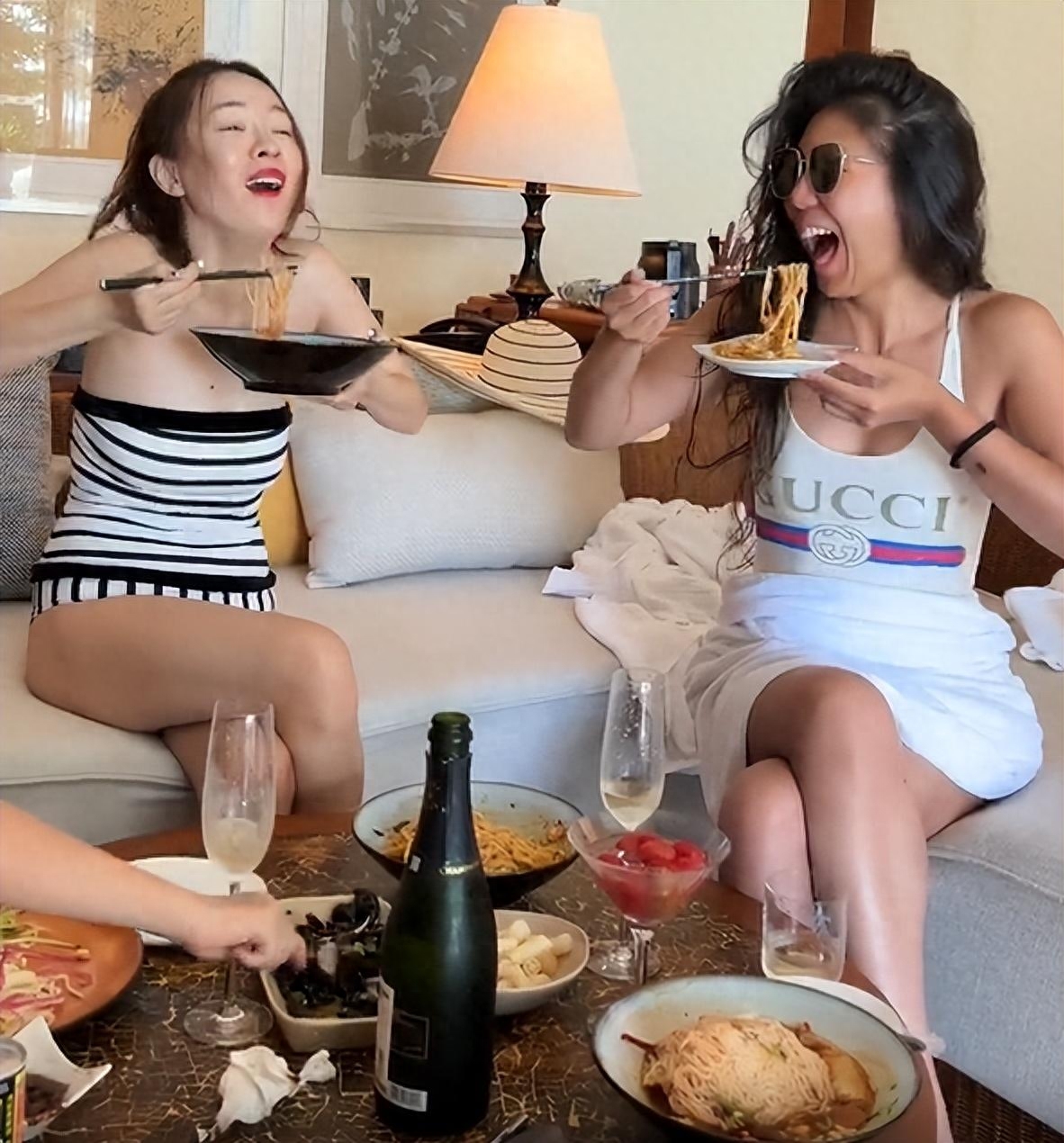 而且他们在泳池中玩得不亦乐乎,霍思燕也是放飞自我,完全不在意形象,尤其是在客厅吃面的画面,更是没有任何形象可言,很是接地气,也是展现了一个真实的她,而且可以清晰的看见她胸口处有一颗痣,很是明显,给她带来别样的美感。