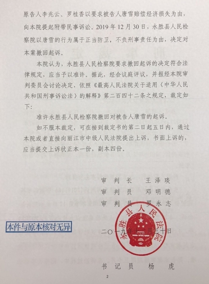 2019年12月30日,云南省人民检察院就“丽江反杀案”发布通报称,唐雪的防卫行为系正当防卫,依法不负刑事责任。当日,丽江市永胜县人民检察院对该案撤回起诉,对唐雪作出不起诉决定。唐雪在被羁押324天后,重获自由。