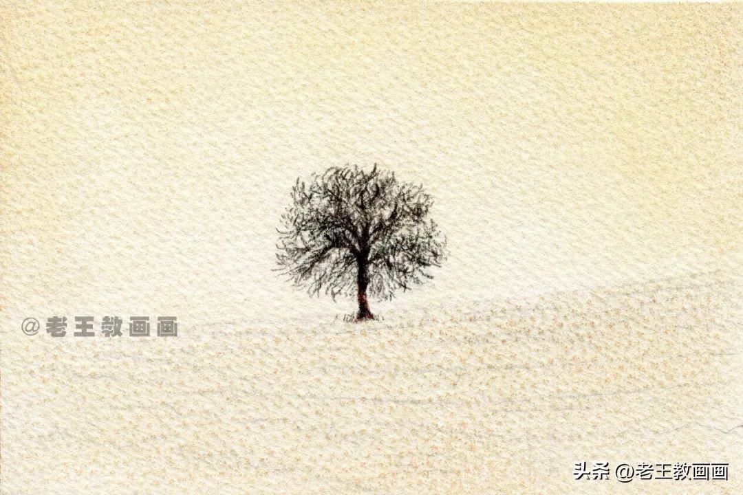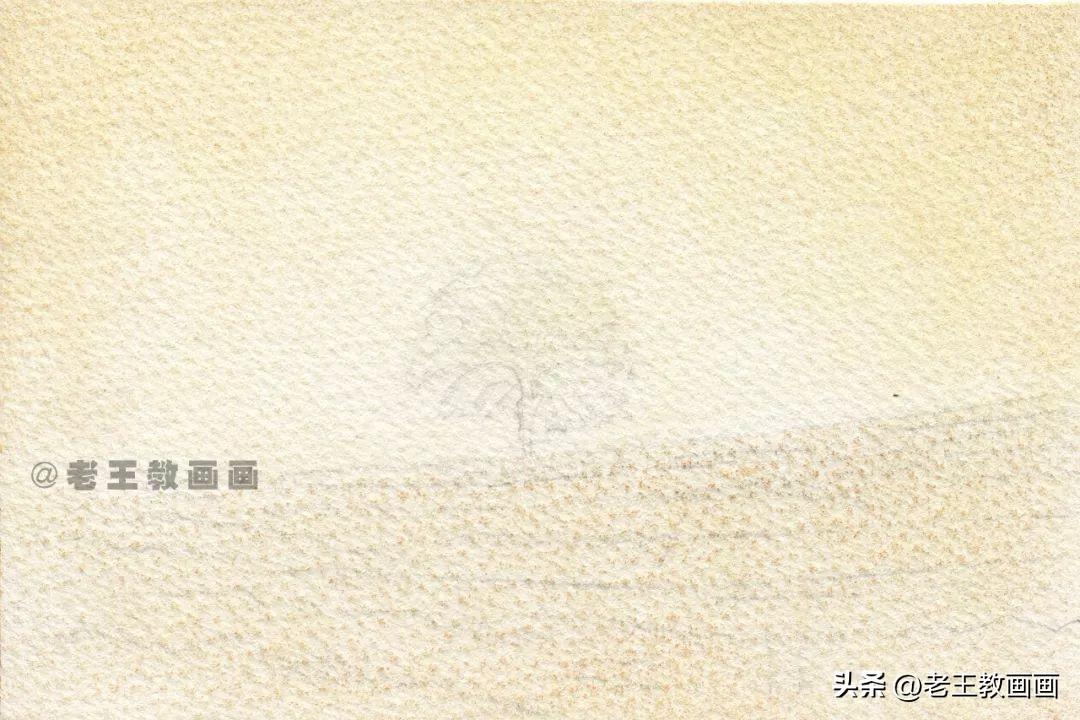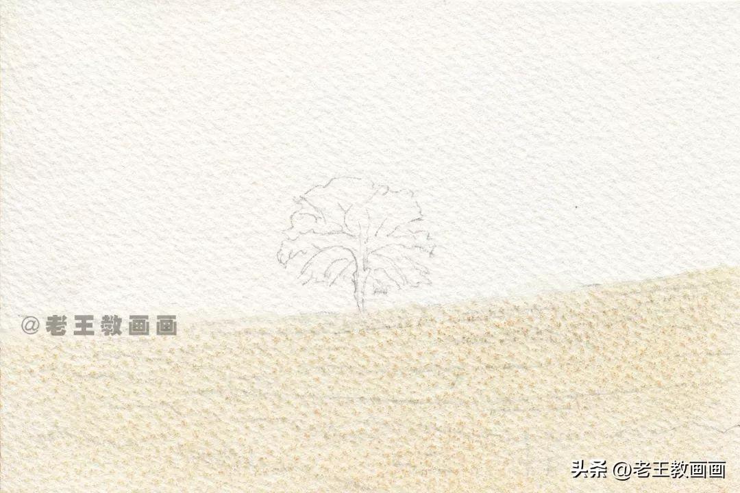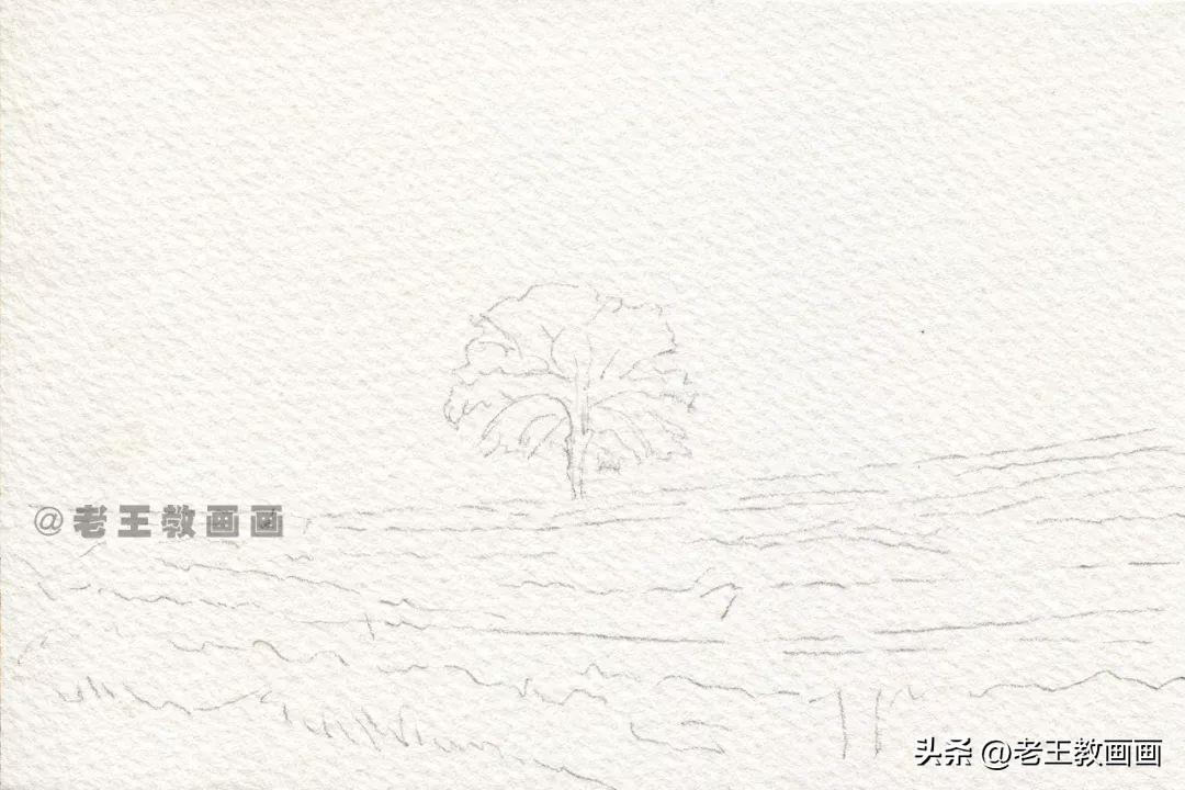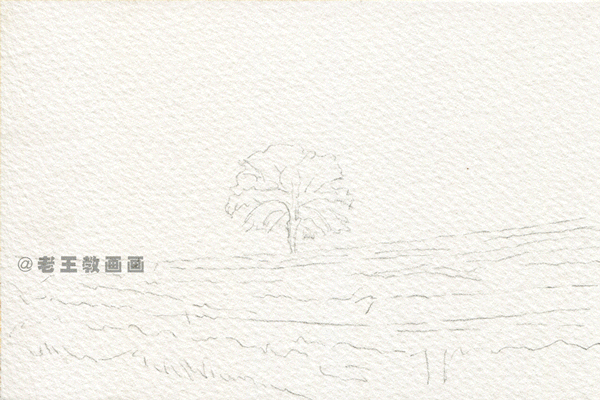 >>>【第1步】:画前分析,这是一幅黄昏风景,画面整体偏黄色调。用铅笔轻轻的起型打底稿,根据纸张的大小确定风景中树和天空的比例位置(p1)↓