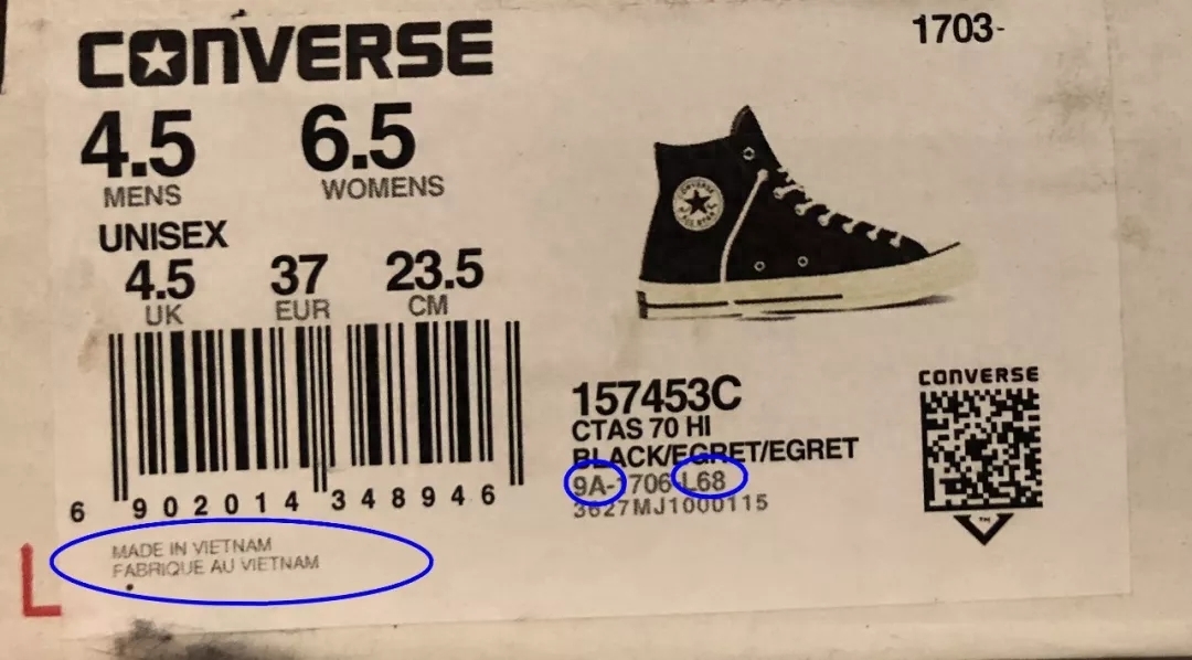 如今市面上的1970s的球鞋基本产地是越南,所以鞋盒上能找到MADE IN VIETNAM 字样,而9A代表越南工厂的代号。
