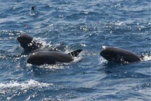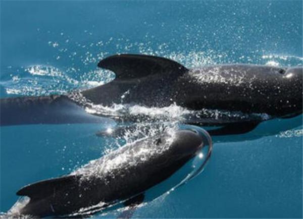 侏虎鲸别称小虎鲸,分布叫广泛,几乎任何热带或亚热带深水海域都可发现其踪迹。主要喜欢吃鱼类。