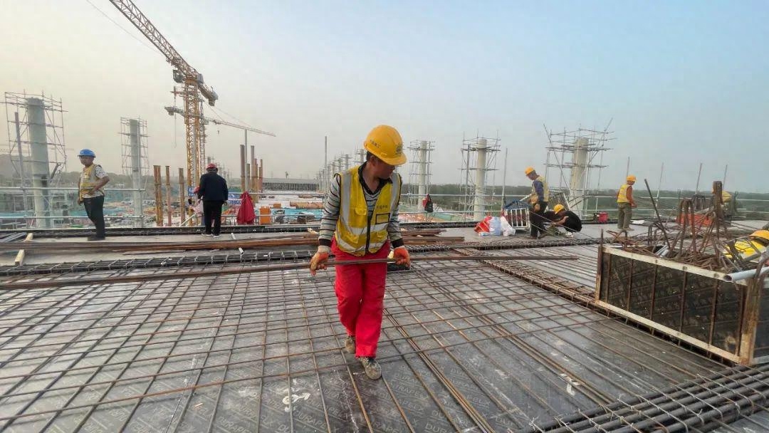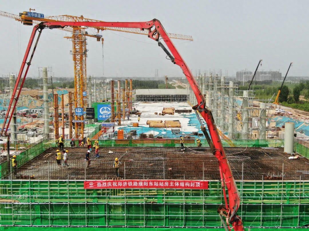 5月8日14时,随着最后一批次混凝土完成浇筑,郑济高铁濮阳东站主站房混凝土结构全面封顶,标志着 濮阳东站主站房结构性工程全部完工,即将进入钢结构吊装、内外部装修和机电安装阶段。