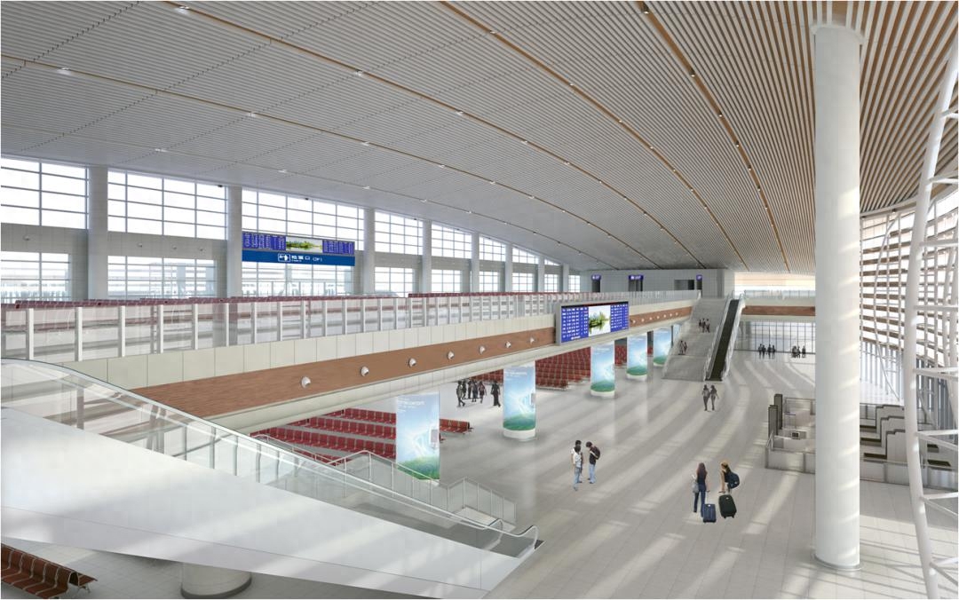 在设计方案中,濮阳东站站房高架平台两侧空间设置出租车、公交车枢纽平台,利用两侧架空屋面下方空间供旅客候车及乘降,一侧平台上设置空铁联运服务站,增加高铁站与濮阳新机场的交通衔接。