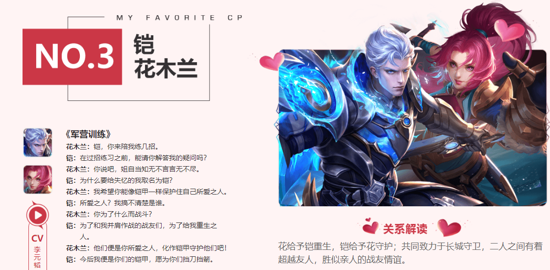 以上五对CP确实都很般配,但是为什么官方竟给花木兰配了2个,这官方是在搞事情吗?其实并不然,从花木兰、兰陵王以及凯的关系中就可以看出来,凯是喜欢花木兰的,但是花木兰却是把凯当成亲人,弟弟一般对待;而兰陵王与花木兰之间的关系则是更偏向于情侣关系,可以说三个人其实是三角恋,哈哈。