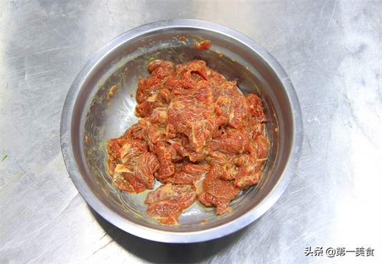 ,再淋入少许植物油,拌匀以后腌制10分钟, 植物油能起到润滑的作用,防止煮牛肉时粘连