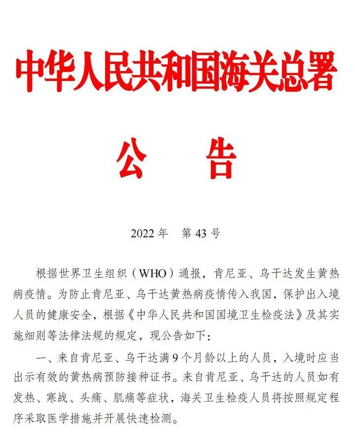 由于黄热病的死亡率高且传染性强,目前是世界卫生组织唯一强制免疫的疾病。5月19日,《关于防止黄热病疫情传入我国的公告》(海关总署2022年第43号公告)发布,严防肯尼亚、乌干达黄热病疫情传入我国,保护出入境人员的健康安全。