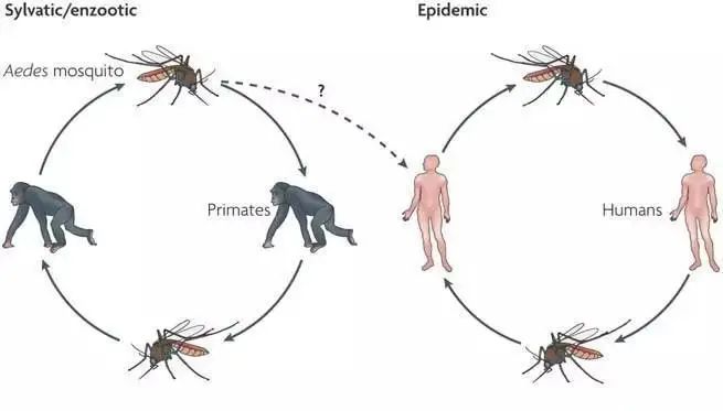 黄热病通过蚊叮咬传播,有两种类型,即城市型和丛林型。城市型以伊蚊为主要传播媒介,以人→伊蚊→人的方式流行。丛林型的媒介蚊种比较复杂,包括非洲伊蚊、辛普森伊蚊、趋血蚊属(Hemagogus.sp)、煞蚊属(Sabethes)等,以猴→非洲伊蚊或趋血蚊属等→猴的方式循环,人因进入丛林中工作而受染。蚊吸食病人或病猴血后经9—12天即具传染性,可终生携带病毒并可经卵传递。